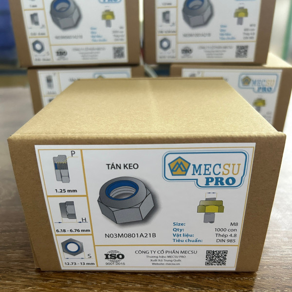 Hộp Tán Keo Thép Mạ Kẽm 4.8 DIN985 M8 (1000 Pcs/Hộp) là một sản phẩm cơ khí được sử dụng để lắp ráp, ghép nối các chi tiết lại thành một khối, là chi tiết kẹp chặt. Tán keo được chế tạo theo tiêu chuẩn DIN 985 bằng thép cấp bền 4.8 sau đó mạ kẽm có màu trắng xanh. Sử dụng để khóa ren trong các mối lắp chuyển động, nơi các mối lắp có khả năng tự tháo lỏng khi chuyển động. Tán keo thép mạ kẽm 4.8 chỉ ứng dụng ở các mối lắp không yêu cầu nhiều về lực siết. Hay sử dụng kèm với bulong cấp bền 4.8.